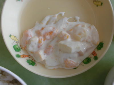 2019年5月20日 13時27分今日の注目は、ヨーグルト和えです。チキンカレーと言いたいところですが、ヨーグルト和えは、かなりバトルになります。フルーツの甘さとヨーグルトの酸味のコントラストがいいですね。デザートに持ってこいです。暑さも吹っ飛ぶ爽やかさ。おいしかったです。