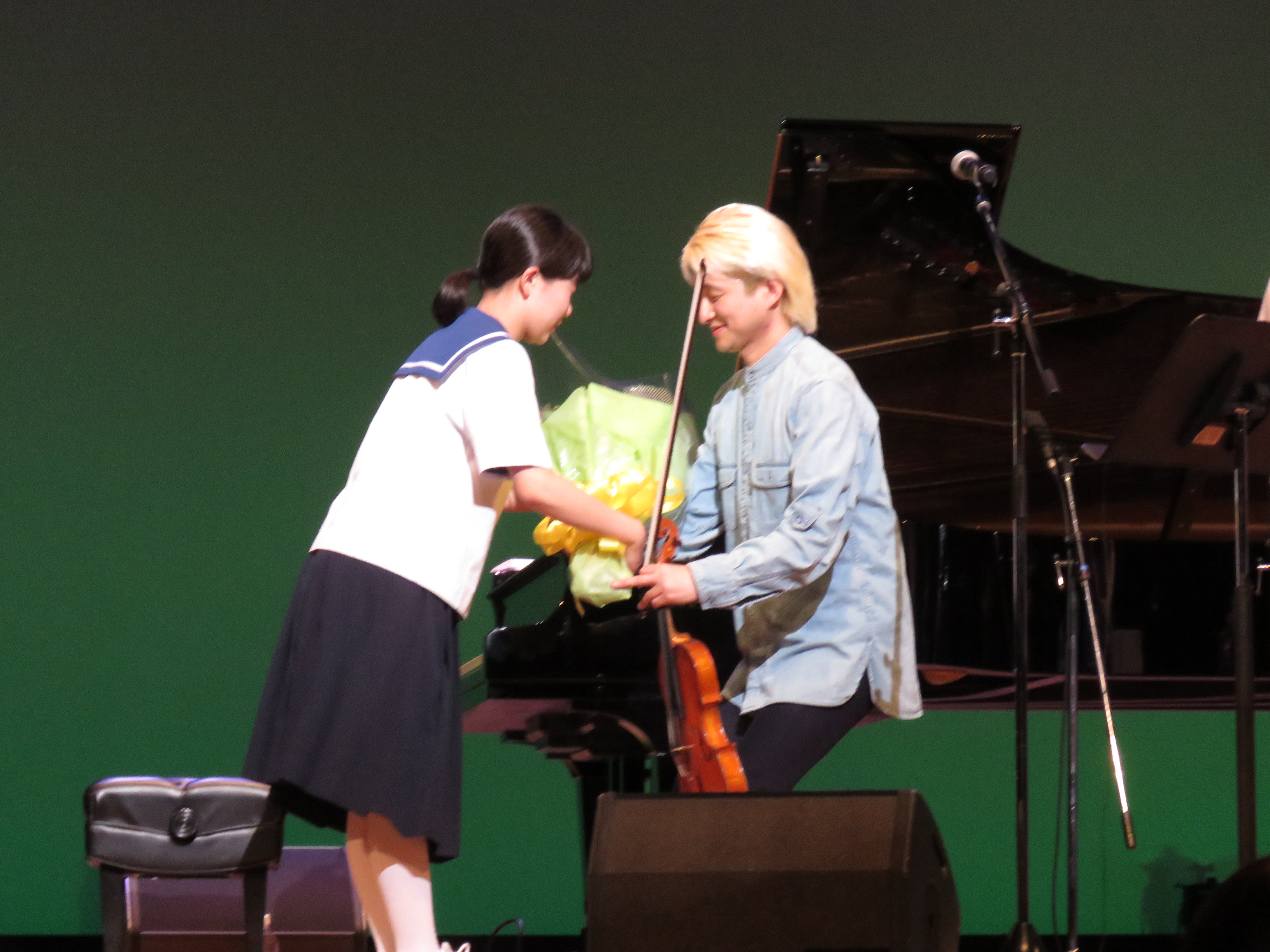 NAOTOさんの公演を鑑賞し、宮本麻衣子さんが、市内の中学生を代表して花束贈呈を行いました。