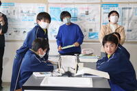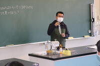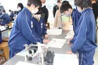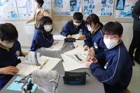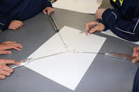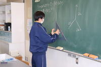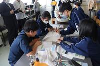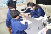 1年生の理科で、3つの力が釣り合うときのきまりを見つける授業でした。ニュートンばかりとバネばかりを用いて、グループで協力してきまりを探していました。どの生徒も積極的に実験に参加し、話し合いが盛り上がっていました。