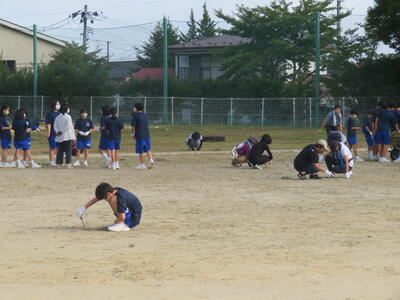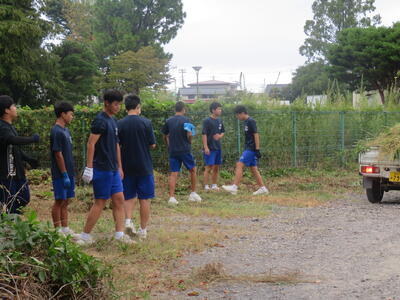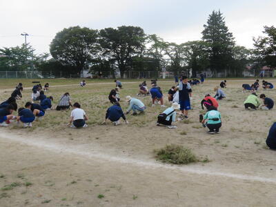 生徒たちが多く参加し、校庭の草むしりや草集め、草運びと朝早くから一生懸命に活動してくれました。