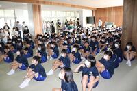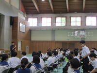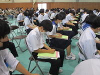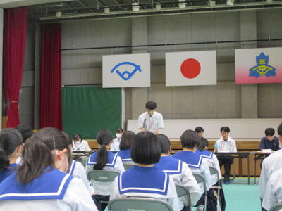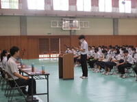 本日、3年生は授業参観で「卒業生と語る会」を行いました。高校3年生の三中の卒業生達が、三中生のために高校の話をしてくれました。高校生から「夏休みに、学習の基礎をかためておく。入試問題を解いてみる。」や「高校でも服装や頭髪は気をつけて生活している。」など、高校のようすや中学3年生の今の時期にしておくべきことをアドバイスされました。「高校生になって、中学3年生の夏に頑張ってよかったと思えるように過ごしてほしい。」とメッセージを贈られ、3年生は進路に向けてさらに気持ちを高める機会になったと思います。話をして頂いた高校生のみなさん、ありがとうございました。