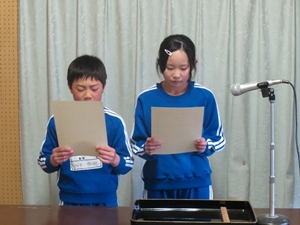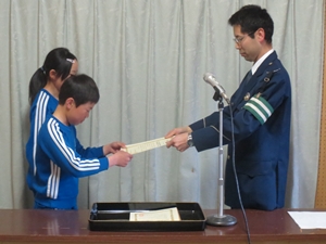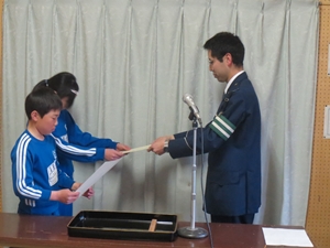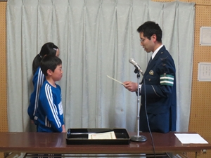 2016年4月7日 16時00分 4月7日(木)、須賀川警察署より、6年生へ「家庭の交通安全推進員」の委嘱状が交付されました。「家庭の交通安全推進員」は、交通安全のため、自身が交通ルールを守ることはもちろん、家族にも交通安全を呼びかけます。6年生の代表児童が、稲田駐在所の大木様から委嘱状を受け取り、誓いの言葉を述べました。