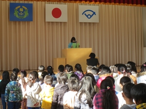「冬休み中、大きな事故やけが、病気をした人もなく、全員が元気に3学期を迎えることができたことが一番うれしいです。さて、インドに『ガネーシャ』とういう、象の顔をした神様がいます。夢や希望を叶えてくれる神様です。稲田小学校にも来てくれるとうれしいですね。そこで、みなさんにも心の中に象を飼ってもらいたいと思います。『〇〇〇(を)〇〇〇ゾウ』という象です。例えば、『漢字コンクールで合格するために、漢字練習をがんばるゾウ』、『なわとび記録会でたくさんとぶために、なわとび練習をがんばるゾウ』という象です。でも、飼っただけでは願いは叶いません。お世話をしないとだめです。がんばることを実行しないと願いは叶いません。がんばってほしいと思います。そして、今年もよい一年にしましょう。」