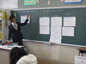 2015年11月26日 13時00分 11月26日(木)、5年生の算数科において授業研究会が行われました。単元は「面積の求め方を考えよう」で、この日子どもたちは、台形の面積の求め方を追究しました。先に学習した平行四辺形や三角形の面積の求め方を思い出しながら、また図形に補助線を入れながら、実にさまざまな方法で台形の面積の求め方を考えていました。友だちに求め方を説明するグループ活動では、友だちの考えを聞いて「なるほど!!」と感心する声もあがっていました。
