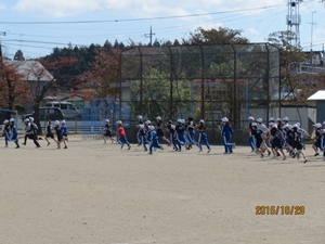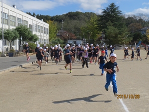2015年10月29日 10時00分 11月18日(水)の持久走記録会に向けて、毎年恒例の業間マラソンがスタートしました。事故防止のため、上学年はトラックの外側を、下学年はトラックの内側を走ります。3分間走り続けることは、初めは苦しいかもしれませんが、毎日走り続ければ必ず持久力がついて、楽に走ることができるようになります。「継続は力なり」です。