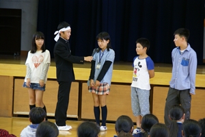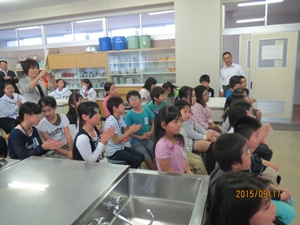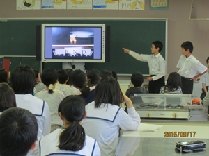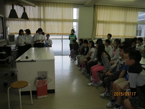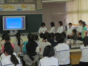 2015年9月18日 10時00分 9月17日(木)、小中一貫教育の一環として、4年生が稲田中学校1年生の職場体験発表を聞きました。子どもたちは、まだ体験したことのない中学生の学習を興味津々に聞いていました。