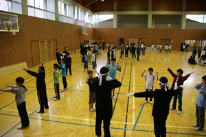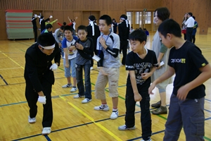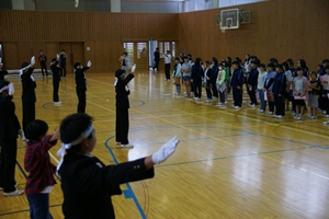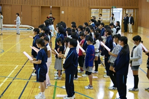 2015年9月18日 12時00分 9月17日(木)、小中一貫教育の一環として、5・6年生と稲田中3学生との第2回小中集会活動を中学校体育館で行いました。今回は、中学3年生に、稲田中学校の応援の仕方を教えていただくという内容でした。黒の制服に、鉢巻を締めた先輩方の迫力ある姿に、はじめ子どもたちは緊張していましたしたが、先輩方が優しく、丁寧に体の動かし方や歌の歌い方を教えてくださったので(その様子は大変微笑ましいものでした。)、次第に笑顔も見え始めました。グループでの練習の後、最後に小中学生全員で練習の成果を披露しました。