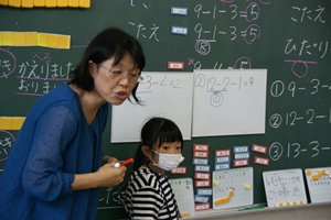 2015年9月24日 12時00分 9月17日(木)、1年生において授業研究が行われました。教科は算数、単元名は「3つのかずのけいさん」です。子どもたちは、バスに乗っていた9匹のねこのうち、はじめに1匹降り、次に3匹降りるという場面から、残ったねこは何匹になるのかを求める式を、ブロックを操作しながら一生懸命考えました。