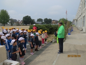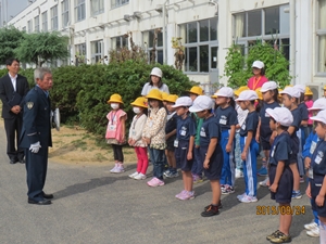 2015年9月25日 10時00分 9月24日(木)、今年度2回目の交通安全教室が行われました。この、命を守るとても大切な教室に、毎日、子どもたちの登下校を見守ってくださっている、稲田駐在所の大木健一様、交通安全協会稲田分会長の有馬弘様、須賀川市交通教育専門員の高田勝男様に講師としてご来校いただき、ご指導をいただきました。