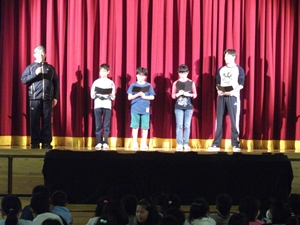第一部では、演劇教室が行われました。ストレッチや発声、発音などの基礎訓練他、6年生の児童が朗読劇にもチャレンジしました。