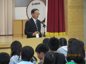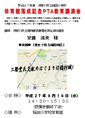 2015年9月17日 10時00分 9月16日(水)は、給食試食会、並びに授業参観、そして体育館落成記念PTA教育講演会においでいただきまして誠にありがとうございました。子どもたちは、いつも以上にはりきって学習に臨んでいました。また、PTA教育講演会では、須賀川市立博物館長兼歴史民俗資料館長 安藤淸美様においでいただき、「歴史で見る稲田地区」という演題でご講演をいただきました。平安時代から江戸時代ぐらいまでにかけて、岩瀬・須賀川、そしてここ稲田地区が重要な地であったことをお話していただき、会を聴講した5・6年生の子どもたちも、大変感心していました。郷土愛がさらに深まったのではないでしょうか。
