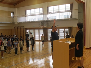 この後、6年生の代表児童が「全学年、安全に楽しく水泳学習をして、少しでも記録を伸ばすことができるようがんばります!!」と誓いの言葉を述べました。