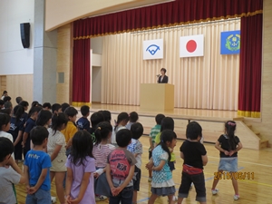 「水泳学習のスタートにあたり、みなさんに3つのお願いがあります。一つ目は『プールに入ることができる日はできるだけ入りましょう。』です。水泳シーズンは短いです。また、来年はもしかすると、工事のために今あるプールに入ることができなくなるかもしれません。感謝の気持ちをもって、たくさんプールに入ってください。二つ目は『目標を持ってプールに入りましょう。』です。8月の終わりには、今よりももっと長く、もっと速く泳ぐことができるようになってほしいです。水泳に関してどんな自分になりたいかをしっかり思い描いて学習に取り組んでください。最後の三つ目は一番大切なことです。『水泳のきまりや、先生方の教えをしっかり守ってください。』です。水泳学習の事故やけがは、すぐに命にかかわります。ルールや約束を必ず守ってください。これら三つのことをしっかり守って、事故やけがのない、楽しい水泳学習にしましょう。」