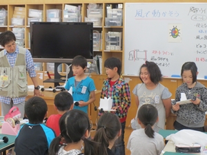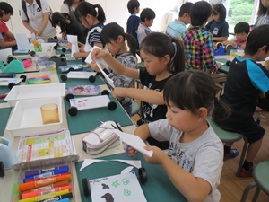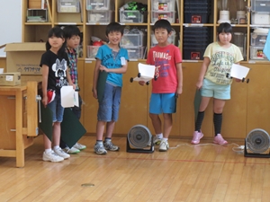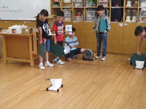 風力で動く車を作りました。風を受ける帆を工夫して作りました。一番長い距離を走った人がチャンピオンになりました。