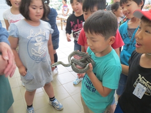 お昼の後、ロビーにいる珍しい世界のカブトムシや蛇を見たり触ったりしました。
