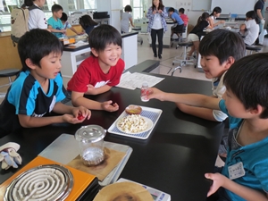ムシテック内にあるビオトープで、水生生物を探しました。タニシやマツモムシ、ヒル、トンボのヤゴ、メダカを捕まえ、じっくり観察しました。