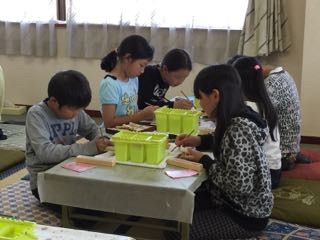 2015年5月22日 13時55分会津若松の「ほしばん」さんで、会津絵ろうそくの絵付け体験をしています。みんな真剣です。