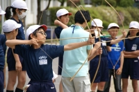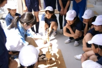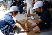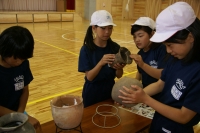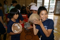 昔の人々のくらしを体験しようということで、縄文土器などを触ってみたり、火おこしを体験したり、弓矢を使って狩りの疑似体験をしたりしました。子どもたちは、「昔の人は、火を使うためにこんなに苦労したんだ。今は楽だな。」「狩りをするのは大変だ。的にも当たらないんでは、動いている動物を射止めるのは難しい、食べ物がなくて生きていけないかも」などつぶやいていました。改めて、物がない時代のくらしを考えると、今がどれだけ裕福なのかが分かったようです。