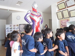 2015年5月27日 17時00分 稲田小学校に「ウルトラマンティガ」の立像が届きました。昨日、子どもたちの下校後に「ティガ」が来たので、朝登校してきた子どもたちはとても驚いていました。特に低学年の子どもたちには大好評で、「やっぱりティガはかっこいいな!!」と言っている子どももいました。立像は、6月1日(月)まで本校に滞在します。