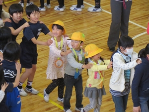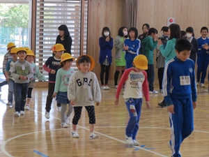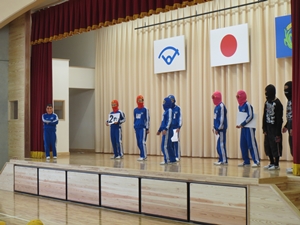 「稲田小学校〇☓クイズ」では、「〇〇レンジャー」にふんした6年生が登場し、劇をしながら問題を出したり、答えを紹介したりしました。1年生も大笑いしながらクイズに答えていました。その後の「貨物列車しゅしゅしゅゲーム」では、全校生が一緒に体を動かして楽しみました。