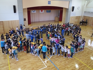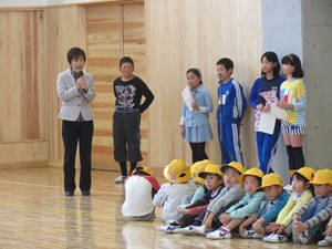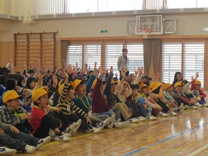 2015年4月22日 15時00分 4月22日(水)、体育館で1年生を迎える会が行われました。会に先立ち、学校長より「1年生のみなさん、今日はお兄さんやお姉さんと一緒に楽しんでください。2~6年生のみなさん、これまで優しく1年生のお世話をしてくれてありがとうございます。今日は、みんなで楽しく過ごしましょう。」と話がありました。また、6年生の運営・集会委員会委員長さんから「ぼくたちは、1年生のみなさんが入学してくれてとてもうれしいです。今日はクイズやゲームをたくさん用意しています。たっぷり楽しんでください。」と歓迎の言葉がありました。