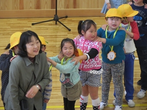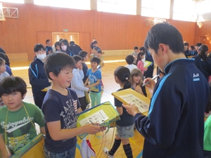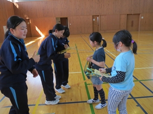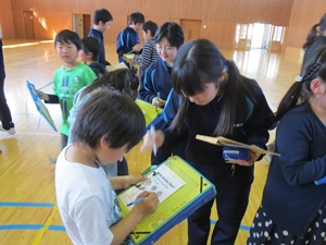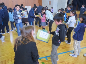 活動の内容は、「What is your name?」を使って名前を聞き合ったり、「What do you like?」を使って好きな果物を聞き合ったり、提示された英語の数と同じ人数でグループになったりする、英語を用いたゲームでした。最初は恥ずかしがっていた子どもたちですが、中学生のお兄さんやお姉さんの優しいリードもあって、少しずつ慣れ、自分から話しかけることができるようになりました。子どもたちは「楽しかった!!」と大喜びでした。