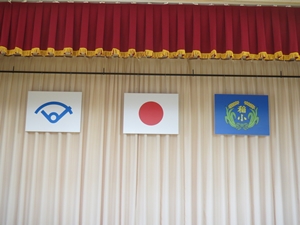 体育館に新しく、国旗、市旗、校章のパネルが入りましたので合わせてご紹介いたします。