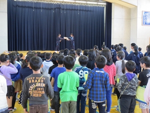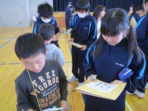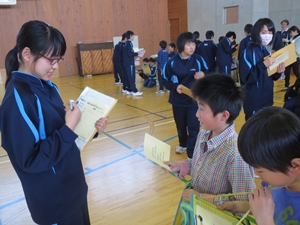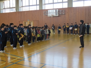 2015年4月24日 11時00分 4月23日(木)、小中一貫教育推進事業の一つである、小中合同集会活動が行われました。第1回目となるこの日は、小学3・4年生と中学2年生による集会となりました。