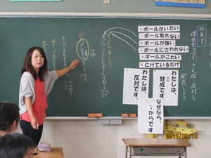 クラス全員が楽しむことができるドッジボールのルールについて話し合いました。「私は賛成(反対)です。なぜなら~だからです。」を使って話すことを通して、「コミュニケーション・スキル」アップを目指しました。