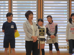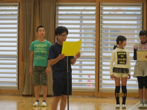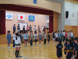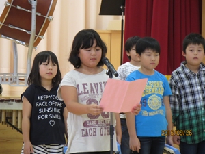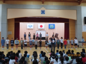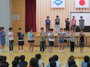 会では、学校長より「4年生のみなさんは、放課後だけでなく、朝も練習に取り組んでいました。大変感心しました。当日は、先生の指揮をしっかり見て、心を一つにして最高の演奏をしてきてください。全校生で応援しています。」と、児童代表より「4年生のみなさん、これまでの練習お疲れ様でした。本番では練習の成果を存分に発揮してきてください。応援しています。」と激励の言葉がおくられました。