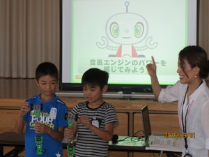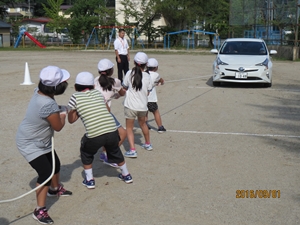 2016年9月2日 10時00分 9月1日(木)、4年生対象に「トヨタ原体験授業」が行われました。空気の押し縮められる性質と縮められると押し返す性質を利用した空気エンジンカーの模型を使った実験を行ったり、本物の自動車を綱で引っ張ったり、自動車の8の字走行を体験したりしながら、自動車を動かすポイントである「パワー」と「コントロール」について学びました。