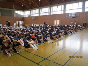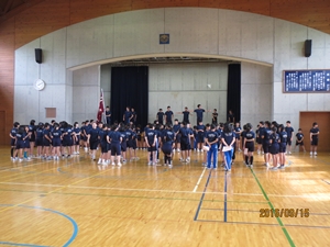 2016年9月16日 10時10分 9月15日(木)、5・6年生と中学3年生による、第2回いなだっ子集会が開催されました。内容は、中学3年生から5・6年生が、稲田中学校の伝統ある応援の仕方を教えていただくというものでした。男子は振り付け、女子は校歌を、いくつかのグループに分かれて教えていただきました。中学生の熱心な指導に、小学生も真剣に練習に取り組みました。「中学生がていねいに教えてくれてよかった。」「中学生が親切に教えてくれてうれしかった。」とういう感想がたくさん聞かれました。頼もしい中学生に、あこがれの気持ちを持った小学生がたくさんいたことでしょう。