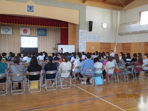 PTA教育講演会では、菊地医院院長の菊池信太朗先生と同医院管理栄養士の高橋先生を講師としてお招きし、「かんたん 健康生活」という演題でご講話をいただきました。先生方には、福島県の子どもたちの健康課題や望ましい生活習慣のあり方、健康な生活を送る上での、よく噛むこと、毎日排便をすること、睡眠を適切にとること、正しい姿勢を保つことの大切さなどについて、ていねいに分かりやすくお話しいただきました。健康教育の一環として参加した5・6年生の子どもたちにとってもよい学習となりました。