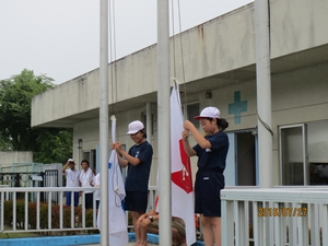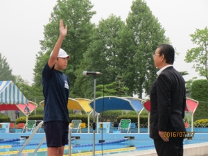 2016年7月29日 12時00分 7月27日(水)、牡丹台水泳場において、第39回須賀川市小学校水泳交歓会が行われ、本校特設水泳部18名が参加しました。校舎改築工事に伴うプール解体により、例年と比べ限られた時間と場所での練習ではありましたが、子どもたちは、一人ひとり素晴らしい泳ぎを見せました。また、今年度は、開会行事の選手宣誓と国旗・市旗掲揚を本校児童が担当しました。須賀川市全部の学校の代表として、見事に大役を果たしました。