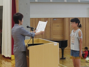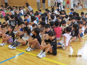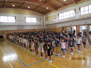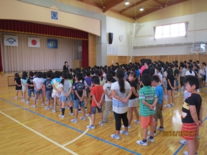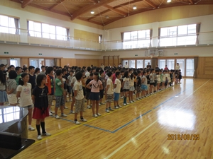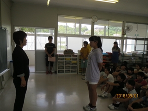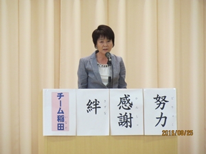 さて、夏休み中にリオデジャネイロオリンピックが開催されました。テレビで見た人もいるのではないかと思います。日本の選手の方たちも素晴らしい活躍を見せてくれました。その選手の方々の話の中で感動したことを、みなさんに3つのお願いとして伝えたいと思います。一つめは、「努力を積み重ねましょう。」ということ、二つめは、「感謝の気持ちを持ちましょう。」ということ、三つめは「友だちとの絆、先生方との絆を強くしましょう。」ということです。これら三つのことを全員で実行して、2学期も「チーム稲田」として、楽しい学校生活を送りましょう。