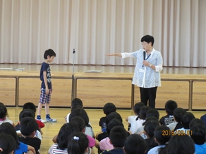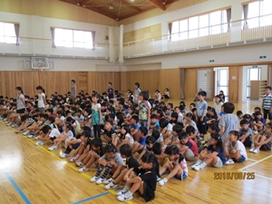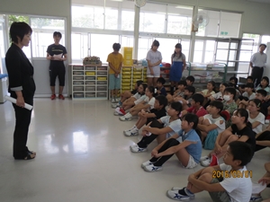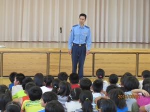 全体会では、稲田駐在所の大木様、須賀川警察署スクールサポータの藤尾様に、学校以外で不審者に出会った際の対応の仕方について教えていただきました。