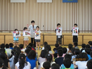 「2学期が始まりました。夏休みに、大きな事故やけががなく、今日こうして元気なみなさんに会うことができたことをうれしく思います。2学期は、新しいお友達2名を加えて、192名でのスタートになります。