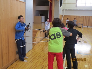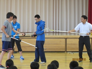 最後に、教職員も、さすまたを使った不審者への対応の仕方を教えていただきました。