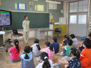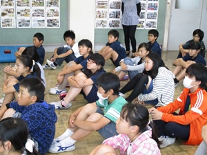 先生方は、いじめが絶対に許されない理由を、過去に起きた、いじめによって尊い命が失われてしまった事件をもとに分かりやすく説明をしてくださいました。その他、万が一いじめを見かけたときの対処法についても教えていただきました。子どもたちは、真剣にお話を聞いていました。