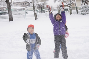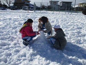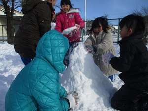3年生は、グループ対抗で“雪積み”をして楽しみました。決められた時間内にどれだけ高く雪を積み上げられるか‥シンプルですが、子供たちなりに色々と作戦を練って競い合っていました。