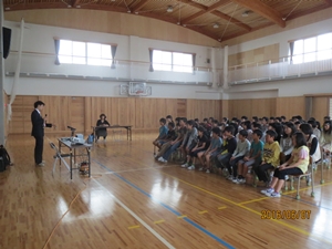 2016年6月9日 10時00分 6月7日(火)、初めてリコーダーを扱う3年生を対象に、リコーダー講習会が開催されました。講師としておいでいただいたのは、下中拓哉先生です。先生には、リコーダーをこれから上手に吹くための、舌の使い方や息の出し方などの基本を教えていただきました。
