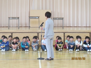 学校長「1年生のみなさん、今からとっても楽しい会が始まりますよ。たくさん楽しんでくださいね。それから、2年生以上のみなさん、運営集会委員会のみなさんを中心に、会の計画と準備をありがとうございました。今日も、これからも、1年生を優しくお世話して、楽しくて笑顔いっぱいの稲田小学校にしましょう。」