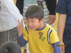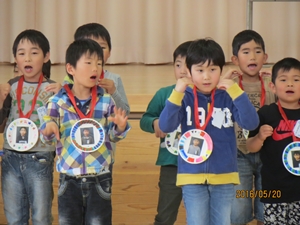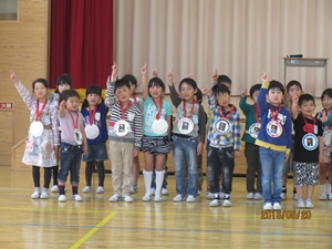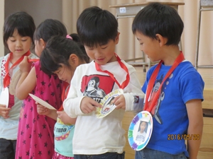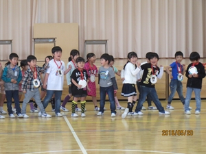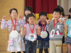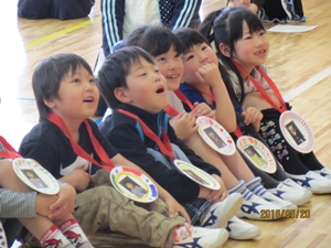 1年生へ歓迎のメダルが贈られました。みんなとても喜んでいました。