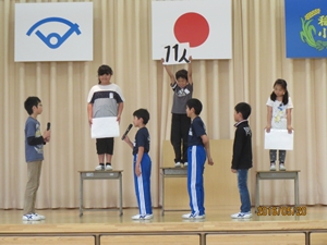 運営集会委員長「1年生のみなさん、運動会でのダンスはとっても上手でした。2年生以上のお兄さんやお姉さんは、優しいですよ。安心してなんでも聞いてください。これからも楽しい行事がたくさんあります。交通事故にあわないように毎日元気に登校してください。みんな仲良く、楽しい学校にしていきましょう。今日は、たくさん楽しんでください。」