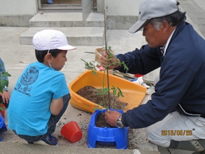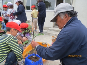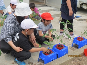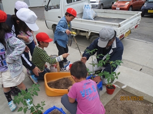 2016年5月20日 18時00分 5月20日(金)の生活科の時間に、スクールサポーターの有馬弘さんに教わりながら、ミニトマトの苗を植えました。一人ひとり、植木鉢に、苗を植えるための穴を、専用の器具で開けました。子どもたちは、竹の支柱に茎を固定する道具にも興味津々でした。農業のプロに教わりながらの苗植えです。たくさんのミニトマトが実ること間違いなしです。