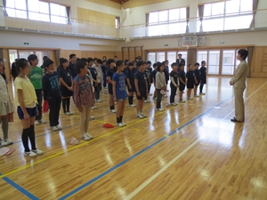 「特設部に所属するみなさんに、3つお願いがあります。一つ目は、しっかり目標を持つということです。特に陸上部は、体力を高めることが必要です。できるだけ日ごろから歩く習慣をつけてください。二つ目は、チームワークをよくするということです。特に音楽部は、心を一つにしなければよい演奏をすることはできません。三つ目は、ルールやマナーを守るということです。大会で学校の外に出ることがあります。稲田小学校の代表として立派な態度をとってください。みなさんの活躍を期待しています。がんばりましょう!!」
