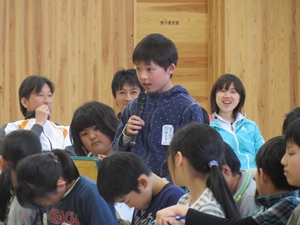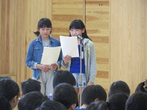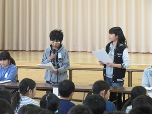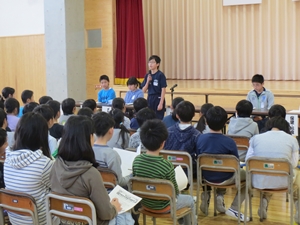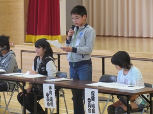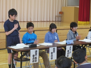 はじめに、各委員会の委員長さんから、今年度の活動計画について説明がありました。その後の質疑応答では、各委員会の活動に関する質問や要望がたくさん出ました。子どもたちの「自分たちの力で学校をもっとよくするぞ。」という強い気持ちが伝わってきました。