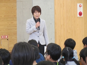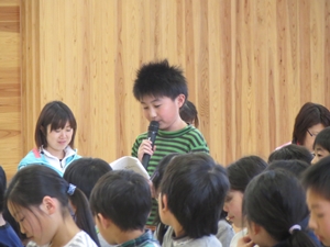 2016年4月19日 16時00分 4月19日(火)、4~6年生が一堂に会して、児童会全体集会が行われました。会の開催にあたり、運営集会委員会委員長さんが「この児童会全体集会は、稲田小学校をよりよくするための会です。一人ひとり、『学校をもっとよくするぞ。』という気持ちを持って参加してください。」とあいさつしました。