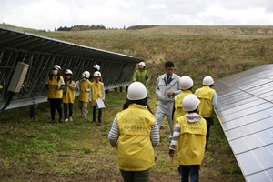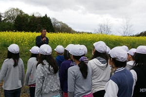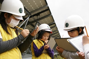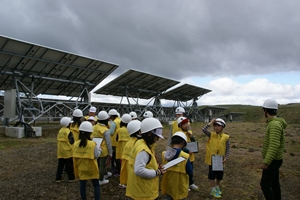 4月22日(金)は、5年生がこのプロジェクトに参加しました。この取り組みの概要を学校で聞いた後、福島空港公園内にある菜の花畑を見学に行きました。1.5haもある畑に菜の花が咲き乱れていました。畑の中央にはジャンボジェット機と同じ大きさにかたどった菜の花畑もあり、子ども達は大喜びでした。次に福島空港に移動し、そこではメガソーラーでの体験学習をしました。太陽光発電のパネルが2000枚もあり、約1200kW(一般家庭330世帯分)の発電を行っています。そのソーラーパネルの表面やケーブルに問題がないかどうかを点検するという体験をさせていただき、子ども達は真剣に巡視点検作業に取り組みました。太陽の動きに合わせてパネル面が移動する先進的なシステムを導入した追尾式太陽光発電システムも見せていただき、子ども達はおどろきながら、バイオマスエネルギーへの関心を高めていました。