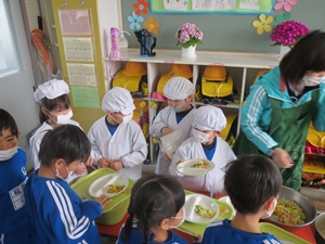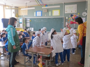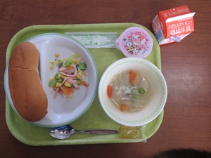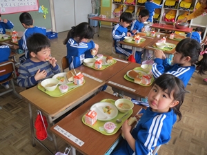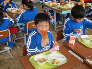 2016年4月14日 16時00分 1年生が楽しみにしていた給食が14日(木)から始まりました。給食当番の子どもたちは、給食着に着替え、教師と一緒に、食器や食缶を教室に運び入れたり、配膳を行ったりしました。当番以外の子どもたちも、上手に給食をもらうことができました。みんなそろって「いただきます!!」のあいさつをして、待ちに待った給食を食べ始めました。今日の献立は、牛乳、コッペパン、シチュー、サラダ、そしてお祝いゼリーでした。「おいしい!!」という声がたくさん聞こえてきました。これからも好き嫌いせずにたくさん食べて、元気に学校生活を送ってほしいと思います。
